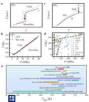 Recently, our team has made a significant breakthrough in addressing this challenge. For the first time, we observed the “all-temperature-range barocaloric effect” in an inorganic plastic crystal material called potassium hexafluorophosphate (KPF₆). By applying pressure, KPF₆ can generate a cooling effect across an exceptionally wide temperature range—from room temperature (around 25 °C) down to the cryogenic regions of liquid nitrogen (−196 °C), liquid hydrogen (−253 °C), and even liquid helium (−269 °C), making it the only solid-state phase-change cooling material to date that operates effectively across the entire temperature spectrum.