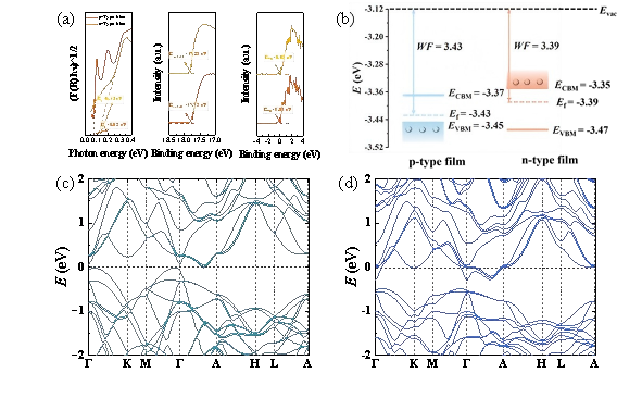 Comparison of band structures between n-type and p-type Mg₃(Sb, Bi)₂ thin films: (Top) Experimental characterization results; (Bottom) DFT calculation results. (Image by IMR)