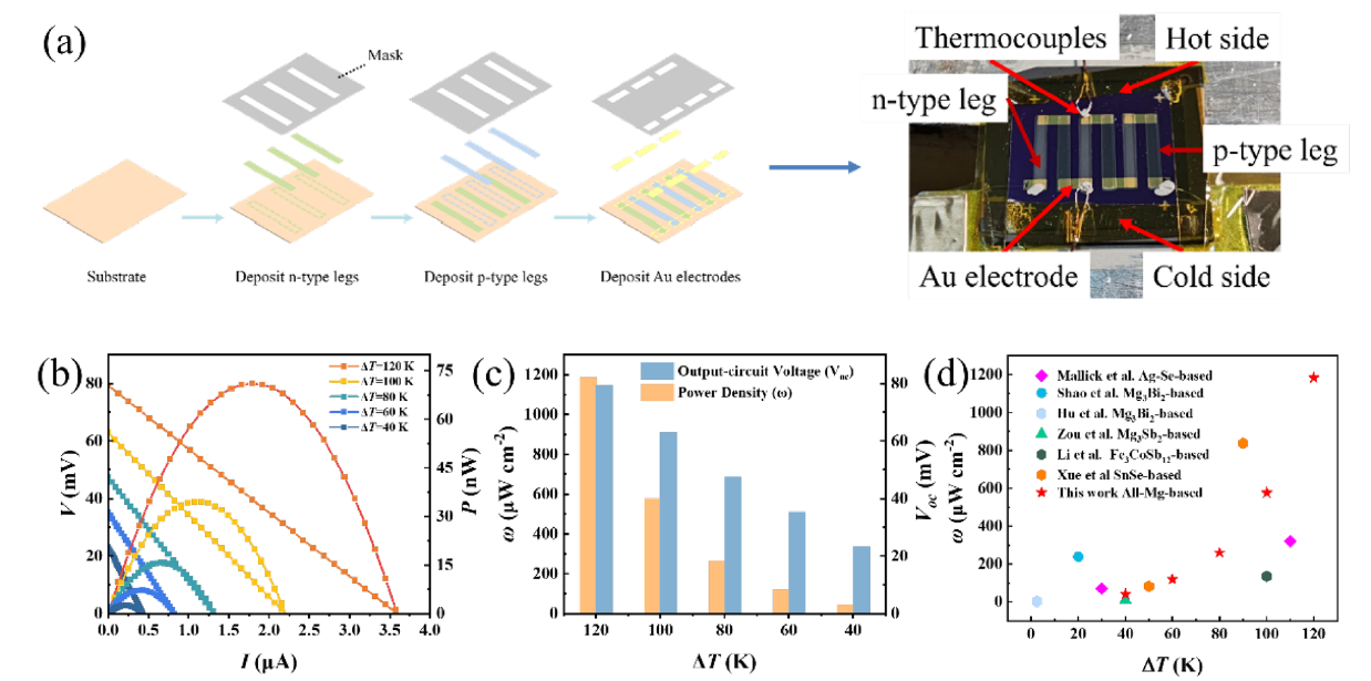 Demonstrating practical potential, an all-Mg-based prototype device incorporating the optimized films generated an output voltage of 73 mV and power density of 1185 μW cm⁻² at a 120 K temperature difference, showcasing capability for micro-power generation in mid-temperature range applications.