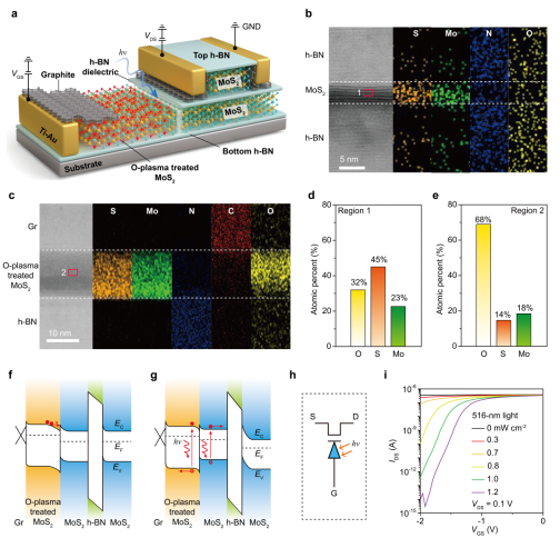 Structure and working principle of the tunable-sensitivity phototransistor. a Schematic diagram of the tunable-sensitivity phototransistor, integrating a MoS₂ field-effect transistor with a photodiode. Hexagonal boron nitride (h-BN) serves as both the dielectric and protective layer, while graphite forms the contact and gate electrodes. b, c Cross-sectional high-resolution transmission electron microscopy images of key heterostructures in the device, showing clear interfaces and well-defined layers. d, e Elemental composition analysis of MoS₂ before and after oxygen plasma treatment, confirming the formation of the photodiode. F, g Schematic band diagrams of the device under dark and illuminated conditions, illustrating the light-induced electrical modulation mechanism. h Equivalent circuit diagram of the device. i Transfer characteristic curves of the device under dark conditions and illumination at different light intensities, demonstrating effective modulation of the photoresponse by both light intensity and gate voltage. (Image by IMR)