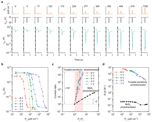 Optoelectronic performance of the tunable-sensitivity phototransistor. a Photoresponse behavior of the device under different light intensities and gate voltages, showing effective tuning of the optoelectronic response via the gate voltage. b Relationship between device current and incident light intensity under different gate voltages, highlighting the enhanced response within specific intensity ranges. c Comparison of current change between the tunable-sensitivity phototransistor and a conventional phototransistor under varying light intensities, showing the device's ability to amplify target light intensity variations while suppressing irrelevant background signals. d Comparison of responsivity between the tunable-sensitivity phototransistor and a conventional phototransistor under different light intensities, demonstrating the significant advantage of the former under low-light and low-contrast conditions. (Image by IMR)
