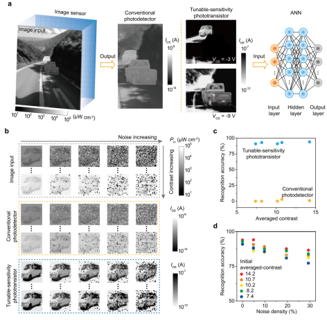 Robust recognition capability for low-contrast targets. a Schematic diagram of an intelligent machine vision system integrated with a tunable-sensitivity phototransistor array. b Imaging comparison between a conventional phototransistor array and the tunable-sensitivity phototransistor array, showing that the latter can more clearly highlight target features under low-contrast conditions. c Comparison of recognition accuracy between the tunable-sensitivity phototransistor and the conventional phototransistor under different average contrast conditions, indicating the clear advantage of the former in complex lighting environments. d Recognition results under salt-and-pepper noise interference, showing that the tunable-sensitivity phototransistor maintains high recognition robustness even in strong noise environments. (Image by IMR)