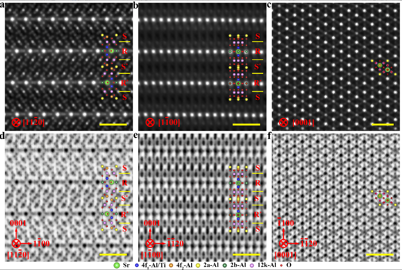 Atomic structure of the SATO thin film along three low-index zone axes. (a-c) High-angle annular dark-field (HAADF) and (d-f) annular bright-field (ABF) scanning transmission electron microscopy (STEM) images viewed along the [1120], [1100], and [0001] zone axes, respectively. The SATO structure consists of alternating rock-salt blocks (R) and spinel blocks (S) stacked along the c-axis. Scale bar: 1 nm. (Image by IMR)