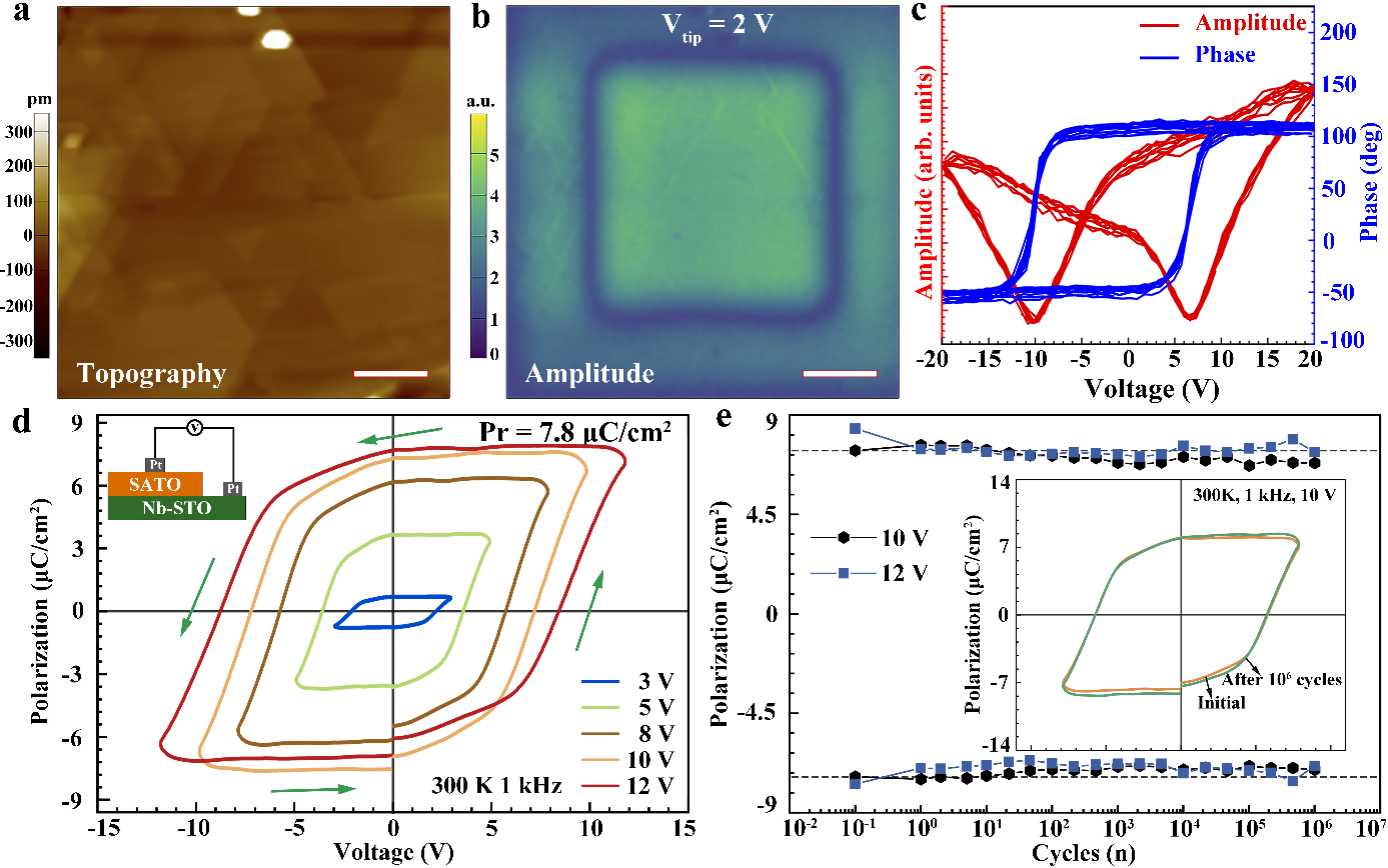 Ferroelectric properties of the SATO thin film. (a-c) Piezoresponse force microscopy (PFM) amplitude and phase images showing clear ferroelectric switching characteristics. (d) PUND-measured hysteresis loop confirming the intrinsic ferroelectricity of the SATO film. The SATO film exhibits a high remanent polarization of 7.8 μC/cm² and excellent fatigue resistance. Scale bars: 2 μm. (Image by IMR)