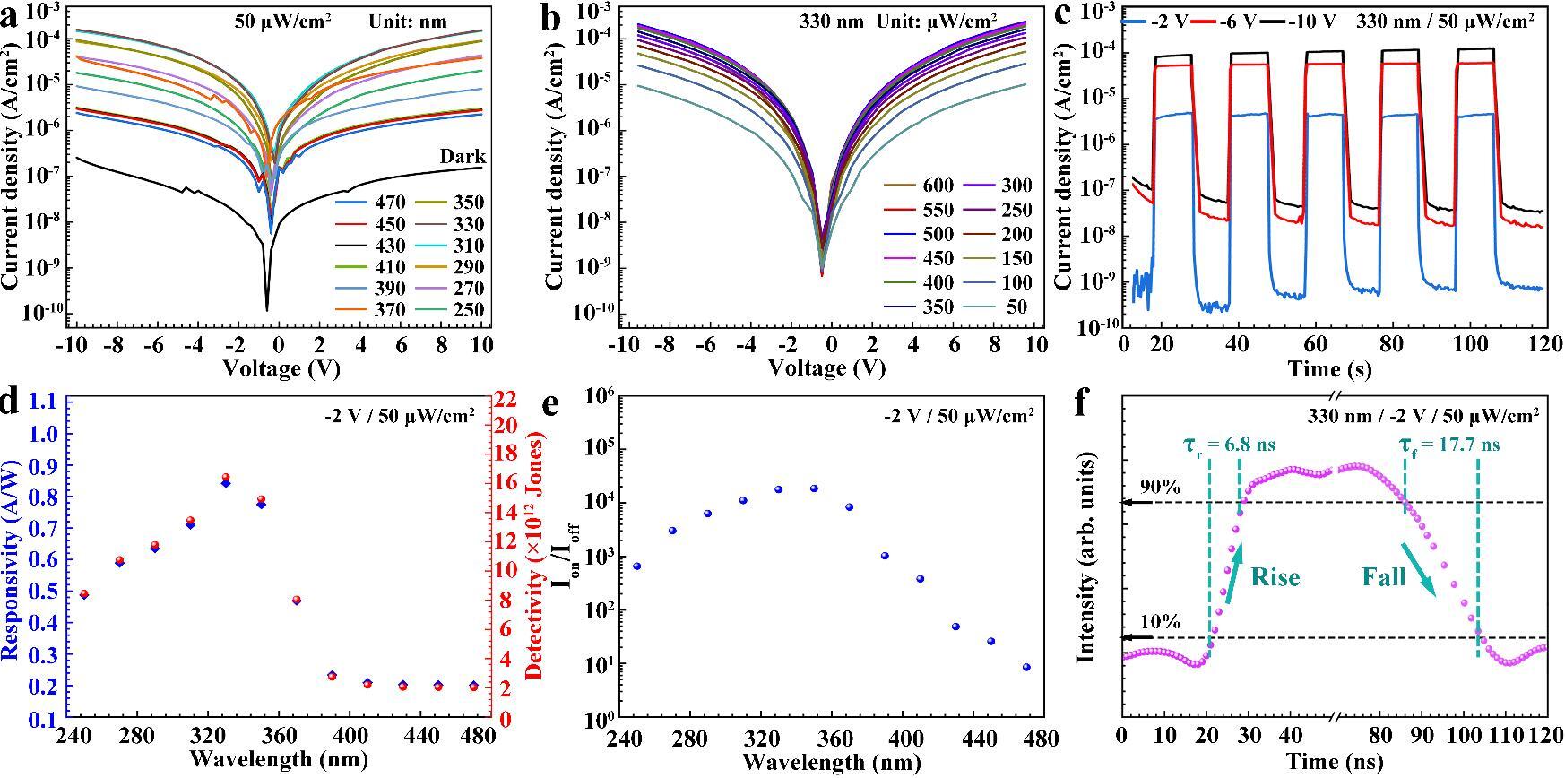 Photoelectric properties of the SATO thin film. (a-c) Photocurrent response curves under different wavelengths, light intensities, and bias voltages. The SATO film shows the strongest response to 330 nm ultraviolet light and excellent weak-light detection capability. (d, e) Responsivity, detectivity, and on/off ratio performance at different wavelengths. The SATO film demonstrates outstanding overall photoelectric performance. (f) Time-resolved transient photoresponse curves. The SATO film exhibits nanosecond-level ultrafast response speed. (Image by IMR)