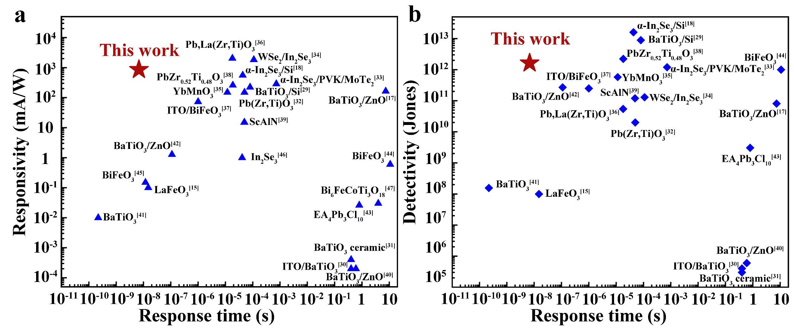 Comparison of the properties of ferroelectric photodetectors. (a) Responsivity and (b) detectivity of ferroelectric PDs. The SATO PDs exhibit outstanding comprehensive properties with high responsivity, high detectivity, and ultrafast response speed. (Image by IMR)