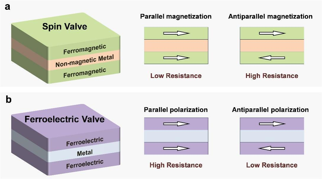 Spin valves, which modulate resistance by controlling spin orientations in ferromagnetic layers, have been instrumental in advancing spintronic technologies such as magnetic memory and sensors. Inspired by the conceptual analogy between ferroelectricity and ferromagnetism, a research team led by Prof. CHEN Chunlin from the Shenyang National Laboratory for Materials Science of IMR has now proposed and constructed a structurally analogous device—a “ferroelectric valve”—where resistance is tuned by switching the polarization direction in neighboring ferroelectric layers.